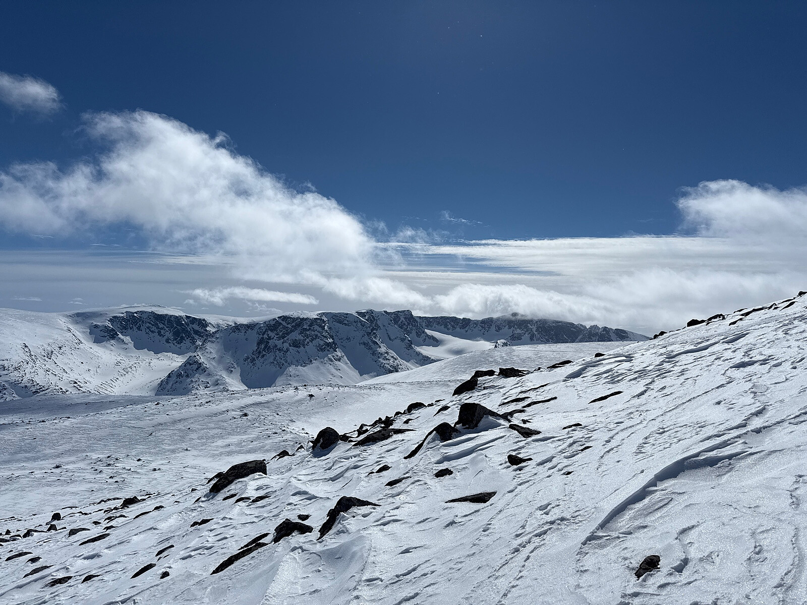 Litt nysnø som vinden har flyttet mye. Vanskelig kjøreforhold uten alpinski pga. stor variasjon i underlaget. Skiene mine begynner å bli utslitt med slarke i begge bindinger. Face-plant på returen..