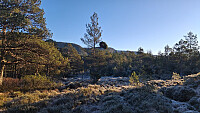 Tur med gamasjer. Brodder var ikke nødvendig. Veldig fin furuskog på fjellryggen, var ikke snø før jeg var over tregrensa. Lett å tråkke gjennom den våte snøen. 3 grader på toppen, 8 hele grader nede ved Klævold.
