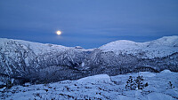 Tur for å tråkke sti før det blir for hardt i den våte løse snøen. Skal prøve å gå flere høydemeter i år, og det hjelper ikke med å bare gå på Hovden. Det er greit å få mer erfaring med å gå i mørkna med ulike forhold. Min første mørketur i snø