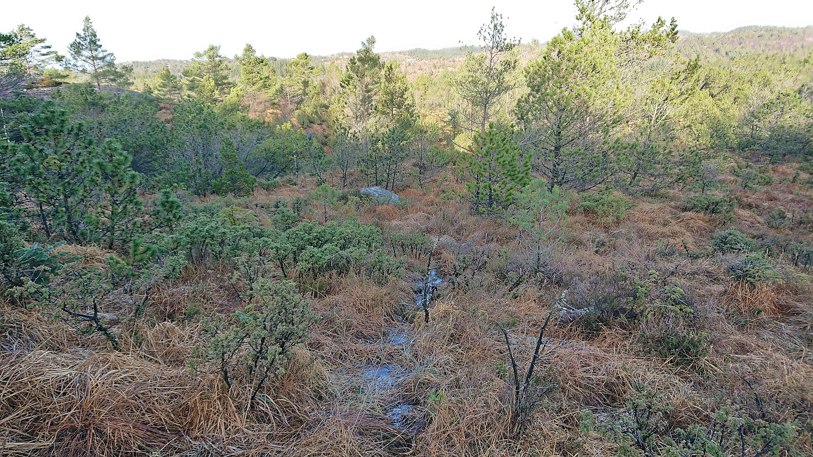 For the second Sunday in a row I returned to Sveio, this time to ascend Nordskogfjellet with an added bonus of also visiting Golfståvo . I started by taking the express bus from Bergen and getting off at the stop "Sveio gravplass". From there I followed the roads north to Nordskog and Skardhaugtjørna where I left the paved road and headed off-trail in the direction of the summit. More traffic than expected for a Sunday morning (or rather mid-day I guess), but even though there were no sidewalks this was generally not an issue.