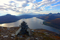 Liten tur etter jobb. Har aldri gått turen uten at det har vært snø på bakken så det var fint å kunne gå på stien denne gangen. Parkerte ved brua i svingen på Kattfjordeidet og gikk rett inn mot skogen og nordøstryggen av fjellet. God sti med litt rødmerking ihvertfall opp til 595moh. Derfra fortsatte jeg på nordøstryggen til toppen og det ble stort sett ur og delvis sti. Ganske lett å gå. Nok en tur med fine høstfarger og sol. Gikk samme vei ned og rakk å komme tilbake før det ble mørkt nok til at jeg skulle trenge hodelykt.