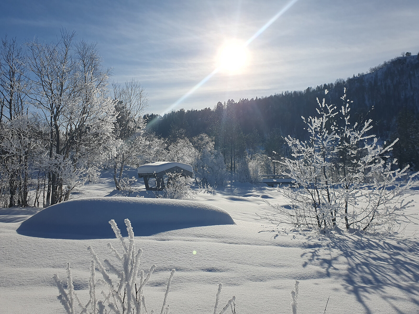 Frisk tur etter dagens OL-øvelser. Felleskiene fungerte bra i fin haglsnø.