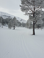 Nydelige forhold i Morken og Nystugubergrunden. Stort sett under tåken som lå på Bjorli i dag. Ca fem kuldegrader, godt blå-extra føre, god glid og godt feste.