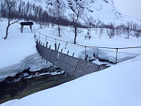 Kort skitur på nullføre og lett snøfall med Peer og Haagen . Turen er i underkant av 6 km og vi brukte i underkant av 1 time. Broen over Storelvi ved Herberget var og blitt ødelagt av store snømengder i løpet av vinteren på samme måte som Vel-broen ved Kårdal. Etter turen laget Haagen snømann ved hytten!