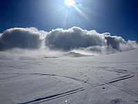 Lavt skydekke i høyden med og meget dårlig sikt til tider. Fulgte derfor veien oppover. Satset på at skydekket var såpass i bevegelse at jeg ville få ørlite sikt i starten slik at jeg kunne sikte meg inn på riktig retning. Det gjorde det også! Etter å ha sluppet meg ut over kanten fra toppen i blinde, tok det ikke lang tid før skyene beveget seg nok til at jeg fikk kontakt med omgivelsene igjen ;-) Det står et par staker i terrenget fra tiden før veien ble laget og de er kjempefine å ha i slikt vær;-) Føret var rimelig bra med store mengder påfyll av snø. Litt lagdelt men helt Ok å kjøre på selv om det kunne vært raskere.