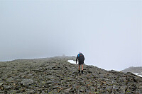 Det var tidvis opphold mellom bygeværet og da var faktisk ikke sikten så ille fra støylen og oppbrukt en ca 800 MOH. Men under bygene så jeg nesten ingen ting og jeg valgte defor å holde meg til veien som merket og går helt opp til Sagetindane. Fra 800 meters høyde begynte virkelig motvinden og sikten var minimal. Her var det bare å snøre igjen jakka med ullbuffen over nesa og la det stå til. Uten metallstikkene >>>
