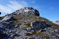 Kjørte rundt til Nordfold og til veis ende ved Sagen. Gikk innover stranda langs fjorden. Bare sporadisk sti, men mye lettere å gå enn fryktet likevel. Fine hytter på Gravneset. Brukte ca. en time inn til Stordalen. Pause ved elva, Bamse fikk drikke og kjøle seg ned mens vi åt. Fortsatte opp dalen i åpen skog til ca. 100m, der fant vi et fint sted langs elva for å sette igjen Bamse, som vi mente var for sliten til å bli med til topps. Men det fant han seg høylytt ikke i, så Egil gikk tilbake og lot han bli med. Ganske greit i starten videre, men kom inn i litt kratthelvete et stykke opp i lia. Gikk etter spor fra Peakbooker Waaktaar. Åpnet seg fra 300-400 meter. På ca. 550 kom vi inn i et lite juv med enorme kampesteiner. Fikk heldigvis med oss at ruta gikk opp en liten kamin til >>>