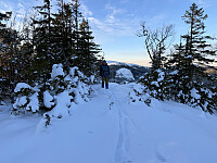 Startet i grålysningen. Kupert landskap første km. Deretter nokså bratt før lettere terreng mot to jamnhøye punkt. Fikk øye på en vardet rute ned igjen.