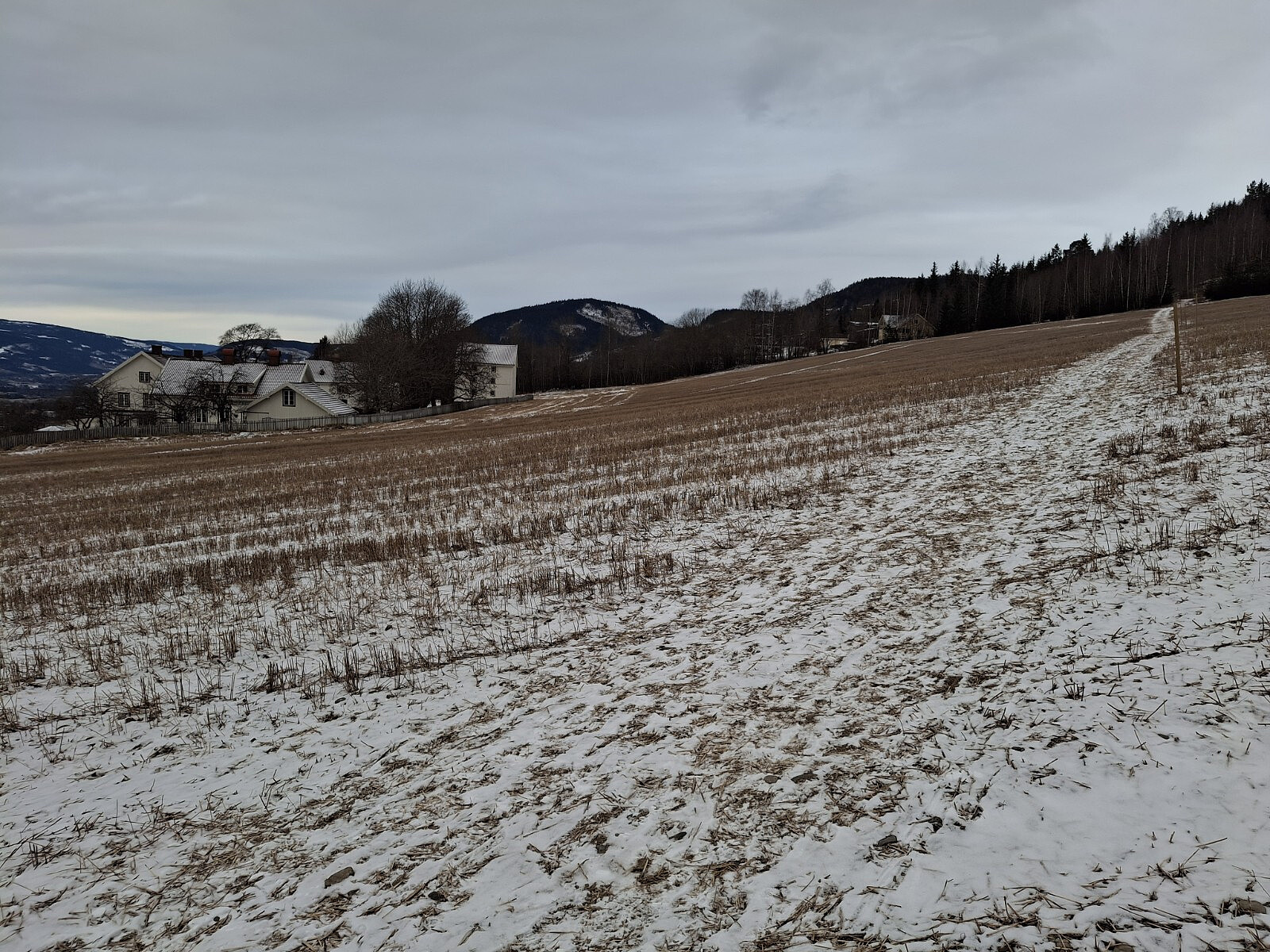 Overskyet, oppholdsvær, ca. 5 kuldegrader, sur nordavind særlig over Randgårdsjordet der jeg fikk den midt i mot.