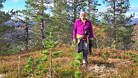 Vi gikk bare på retningen oppover, litt vått, litt kratt, litt myr og etterhvert litt bratt, men helt framkommelig. Vi kom oss opp på toppen, helt anonym. Litt utsikt på sidene, men ikke den store opplevelsen.