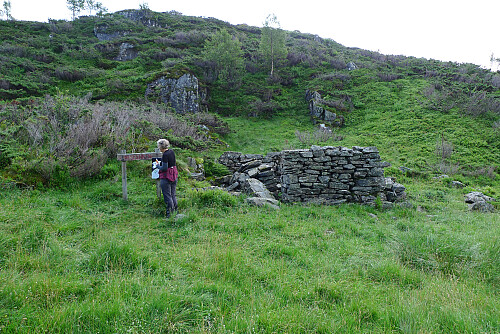 Det var en god avgjørelse, for lørdagen ble den fine dagen værmessig som meteorologene hadde lovet. Vi parkerte på Hålandsheio parkering der det er god informasjon om Hålandshovda på østsiden av veien, men ingenting om storebroren Håfjellet! Turen til Håfjellet er omtalt i boken Opptur Hordaland side 236-7 av Finn Loftesnes og OppturAnne (Anne Rudsengen). Turdataene her er litt forskjellige fra våre - oppgitt lengde 8 km og 3 timer t/r. Min GPS viste ca. 10 km, og du skal gå rimelig raskt for å klare denne turen på 3 timer. Turstart på vestsiden av veien der det står et gammelt treskilt. Stien starter opp en våt gressbakke/myr. Den er tydelig og godt merket, men går i meget vått terreng opp til godt forbi Langemyr på ca 500 moh. Kort stopp ved stølsmurene etter den nedlagte Nesestølen der det er laget til kasse og turbok.