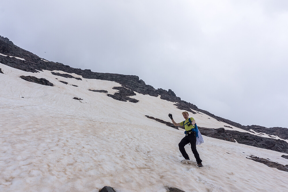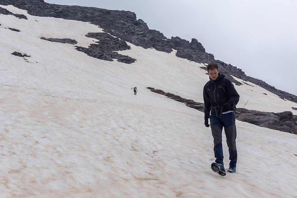 Vi kom etterhvert opp til et svært snøfelt. Dette strekker seg over et ganske stort område og er vedvarende bratt hele veien. Det var tråkket gode spor oppover fra før, og vi følte aldri behov for øks eller stegjern. Vi så likevel et taulag lenger borte. Dette feltet er ikke tegnet inn som bre på kartet, så vi antok at det bare var rester fra vinteren. De fleste andre franskmenn gav oss noen rare blikk da vi kom spradende opp her iført fjellsko, shorts og baris. Selv gikk de med bukse, jakker, gamasjer, støvler, stegjern og isøks. Har hørt litt rykter om at fjellkulturen i disse landene i stor grad baseres på faste prinsipper og dermed til tider kan virke litt "overkill".