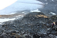 Ein hylleformasjon gjekk ned til venstre som einaste alternativ så eg tusla ned der. Enkelt til å byrje med men eg fant raskt ut at det var best å dytte kameraet i sekken. Mens eg pakka ned kameraet gjekk turfølget forbi og ned dei siste metrane. Eg kasta sekken på ryggen men fekk berre teke eit par skritt før ei djupt romling avslørte at steinblokka i mangehundrekilosklassa eg hadde foten på ikkje lå heilt stabilt. Ei høfleg, velartikulert åtvaring vert overbrakt turfølge