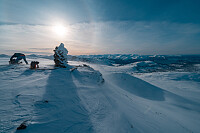 Startet fra Ålesund kl 07 i morges og parkerte ved langrennsløypa i dalen hvor det var oppkjørte løyper til Grytalisætra (1.6 km). Herfra ble det offroad i en halvmeter pudder. Rundet Blåfjellet og tok sikte mot ryggen opp til Sunnmørslauparen. Vi valgte venstre side og kom til et platå hvor utsikten åpnet seg mot Lauparen. Herfra så den rimelig brutal ut og vurderte om vi valgte riktig topp i dag. Fortsatte til fots med stegjern pga hardbanka is til Sunnmørslauparen. Det ble en god del vind resten av turen. Skled ned til bunnen av skaret og parkerte skia. Ryggen begynte relativt greit, men ble ganske smal på noen partier. Da det var ca 150 hm igjen måtte vi traversere over et renneparti stappfullt av snø. Gravde en snøprofil, men fant ingen svake lag. >>>