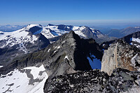 Merket sti opp til toppen av Kaldtinden her tok vi en pause i varmen før vi gikk ett lite stykke tilbake og ned en renne og videre lettgått opp på Grøntinden. Her oppe var det en fin sofagruppe i stein greit å sette igjen den eldste hunden her (Ivrig på 11 år) før vi fortsatte etter ryggen og opp på Prosten. Nøt utsikten på toppen før vi returnerte tilbake til Grøntinden og gikk bratt ned fra her. Fin dag i fjellet og vi fikk noen ekstra A- og C-vitaminer på denne turen da det var litt multer å kose seg med.