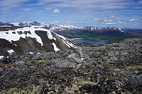 Inn for å sjekke hytta ved Springtverråtjøna, gikk opp fra Langoddsiden. Tok turen opp på Storhornet først videre over Åmellomfjellet og ned til hytta Armoa. Lang god pause her i solsteika før jeg gikk ned Storbekkdalen og ned til bilen.