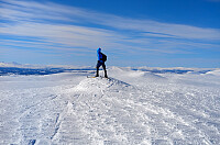 Bortsett fra vinden som var ganske irriterende ble dette en innholdsrik tur. På Penningkeisa observerte vi flere scooterspor med oppgang fra svensk side. Etter riksrøysa la vi kursen mot Oivisfjellet. Underveis kom vi tett innpå en jerv som forsvant lynraskt og vipps så var jerven ute av syne. Deretter en matpause ved den vesle gjeterbua til samene. Vinden økte til stiv kuling på Oivisfjellet. Skled ned ca 300 hm før vi "blåste" opp til Strifjellet. Vi så for oss en lang og fin nedkjøring fra siste fjell, men motvinden bremset farten og ødela skli-strekningen. Uansett en fin rundtur i høyfjellet. Ekstra hyggelig at TERJES (TERJE STRØMHYLDEN) stakk innom på Ytterdalstunet. Her ble det servert viltgryte, ris og tyttebær.. // Et terningkast 6 var forventet, men vinden endret >>>