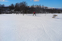 Langrennsløypa fra Løvsjølia til Langvatnet var gull verdt selv om det er litt kjedelig å gå med fjellski i slike løyper. Etter 8 km forlot vi løypa og la kursen over 3 små vann. Deretter opp nordryggen som var nokså isete. Også i dag mye vind på toppene. Fin utsikt mot Kjerdelsfjellet som er greiest å nå fra Estilseteren.