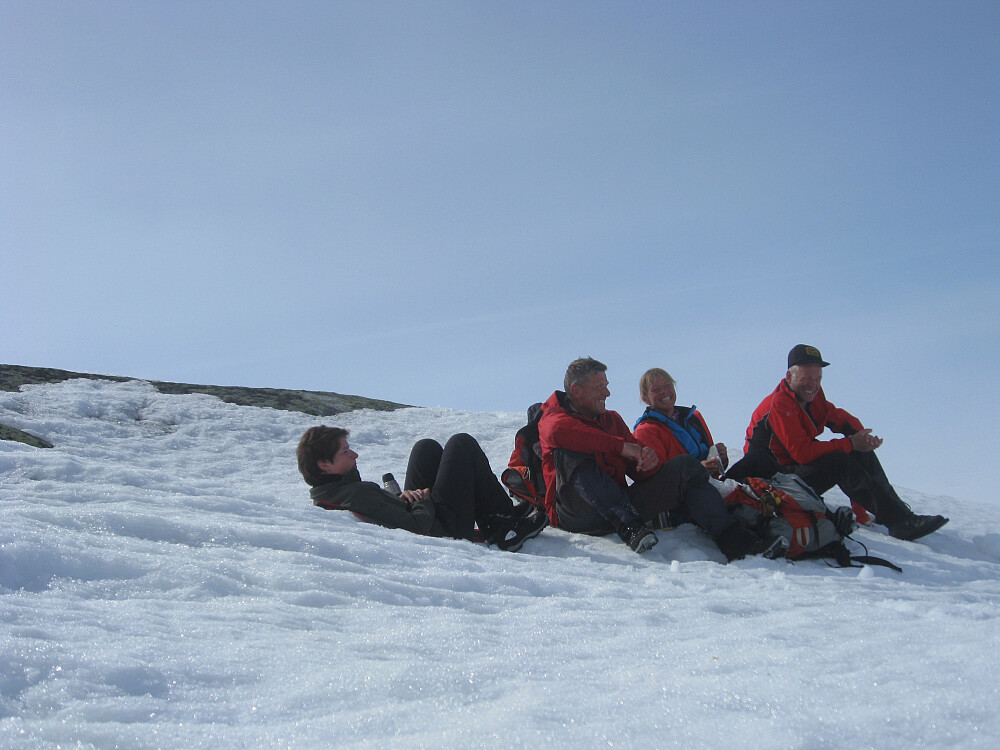 Etter gårsdagens tur til Nuppseggi og Sandfloegga ble teamet utvidet til fire personer. Geir Eidsvik bosatt i Kvinnherad var lysten på en fellestur. Vi startet fra Haukeliseter og fulgte skisporet retning dagens mål. Rundet Kistenuten hvor det var gått flere bløte snøras. Fortsatte bratt opp fra tjønna i Lisledalen. Videre over nordøst-ryggen til Vassdalseggi (1685). Kunne skimte Folgefonna i vest. Returnerte på bløtt gjennomslagsføre. // Turfølge - Inger Lise, Geir og Anneli.