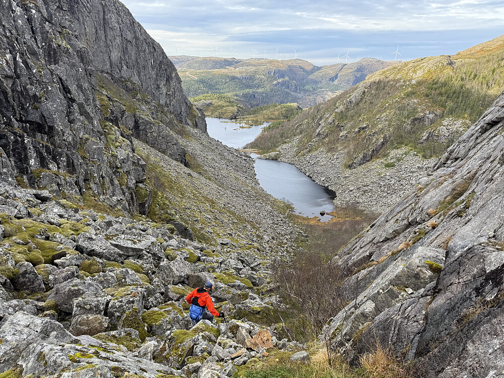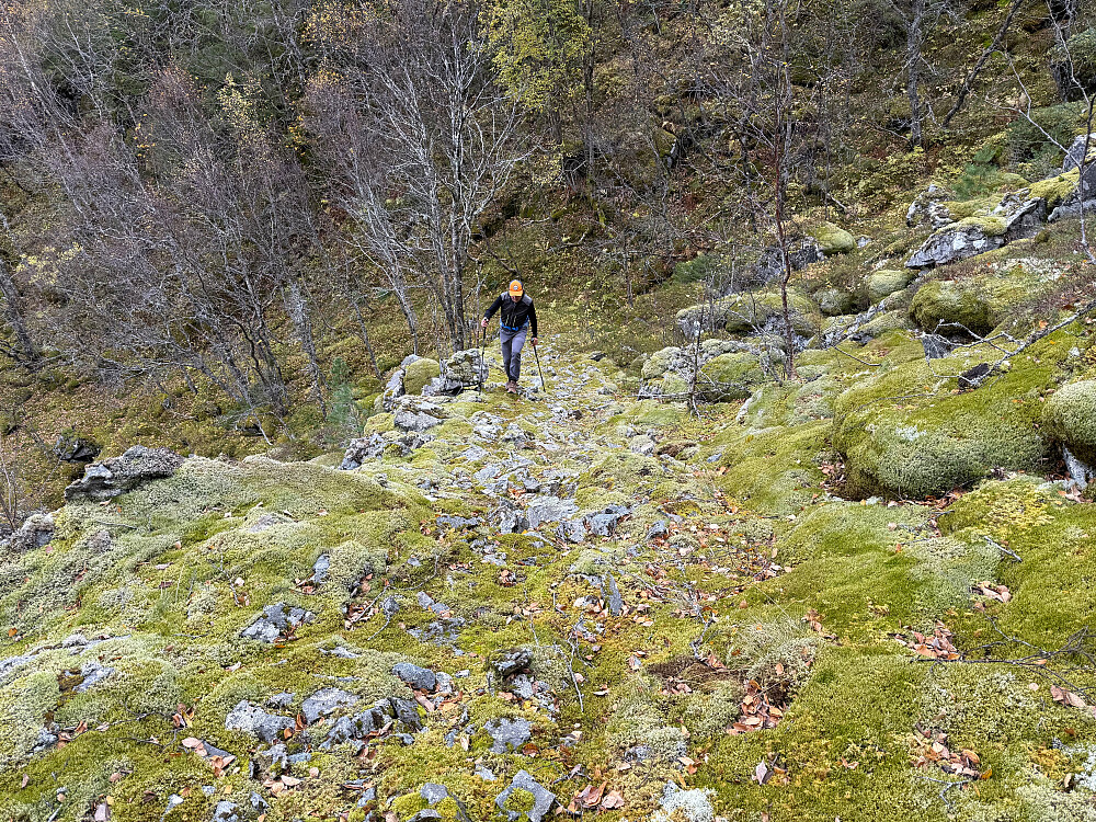 Skolebussjåføren i Nordbotnen tipset om en grei rute opp til snaufjellet. En utydelig sti som var delvis rødmerket fikk oss på rett vei. Etter myra kom vi innpå en gammel steinsatt sti opp til Fossvatnet. Fjellryggen opp til Vedaliheia gikk helt greit. Videre ble det vill-gåing til Lavassheia og Bjørnabakklumpen. Planen var å nå Bjørnabakklumpen fra Bakkdalen. Underveis endret vi taktikk og tok alle 3 i et jafs. Returnerte ned skaret til Midtre Fossvatnet. Etter steinura var vi tilbake på stien. // En variant er å gå fra det vesle småbruket nederst i veien. Denne stien kom innpå vårt rutevalg.