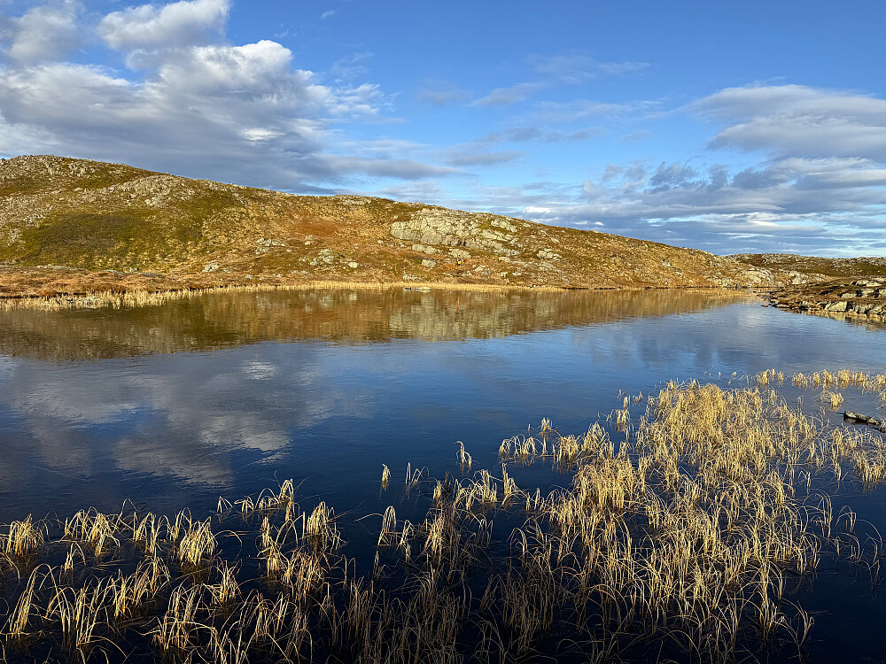 En fin dag på Fosen i lav novembersol og helt vindstille. Først fulgte vi stien som var gruslagt helt frem til Skamnavatnet. Neste etappe ble villgåing via Reinsjødalen til Tekssjøhøgda (582). Deretter ned i Finnburskardet før oppgangen til Kastbotnheia (610). Dette ble siste topp over 600 meter på Fosenhalvøya (totalt 17). Myr-vandring er vi blitt godt vant med og synes det er helt greit. Stort sett snaufjell over 300 meter.