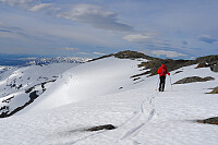 Kjørte fra Hellesylt til Vollset (skiltet Fedalen). Passerte gårdstunet og parkerte på andre siden av elva. Startet på rødmerket sti opp ved Fedalselva. Fortsatte etter sti-tråkket vest for Storvatnet til Vollsæter (ingen bygninger å se). Videre på tungt "sugeføre" til et skar litt nord for toppen. I området var gått flere ras. Greit videre til høyeste punkt (1609). Fin utsikt mot Lodalskåpa, Stolshyrna og Sunnmørsalpene.