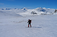 Etter to fine dager på Ringebufjellet slo vi følge med "godværet" til Grotli Høyfjellshotell. Her var både hotellet og skiheisen stengt, men skitraseet opp til endestasjonen var ferdig preparert til påskegjestene. Vi gikk øst for Kjerringtjønne til 1429 høgda. Deretter opp til Krosshø (1857). Ved varden hadde en jerv satt sine fotspor i snøen tidlig på morgenen. Glimrende utsikt mot Møre & Romsdals 1800 meters topper i nord. Lettkjørt retur på godt føre med en innlagt kaffepause.