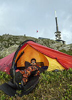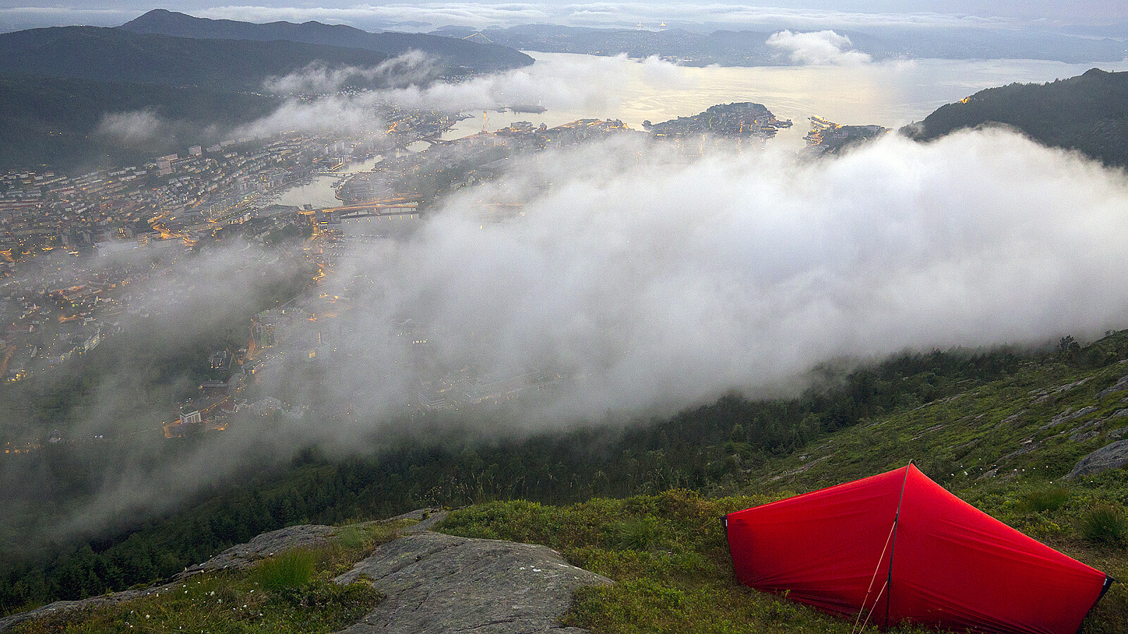 Litt sliten i går etter 50t jobbing på fire dager og en formiddagsøkt på treningssenteret. Bestemte meg for en kort tur. Gikk hjemmefra opp til et supert sted å telte på Ulriken. Satte opp teltet og bare nøt dagen. Tok banen ned igjen i dag tidlig