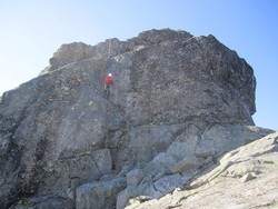 Topphammeren er bratt med et riss som følges opp. God standplass på hylle skrått nedenfor. Risset begynner moderat med ca. 3 meter grad 3 før det bratner til med mindre tak de siste 2-3 meterne. Anslått grad her er 5. Det er greit å lage fotløkke ved hjelp av kamkiler i risset.