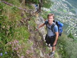 Etter å ha passert ur nedenfor stupene må en klyve opp ett luftig parti før en kommer opp i vegetasjonen igjen.