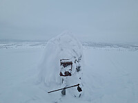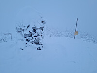 Yr.no spåddestrålende vær, med sol fra skyfri himmel, så i troen på dette fant jeg fram fjellskoene for å brøyte meg til Prestkjerringa. Men - skodda lå tjukk hele dagen, så ikke antydning til sola. Men Prestkjerringa ble det, selv om det et par steder var vanskelig å finne fram,da jeg ikke kunne se fra brøytestikke til brøytestikke. . Tung brøyting fra Nysetra, men med fjellski gikk det greit.