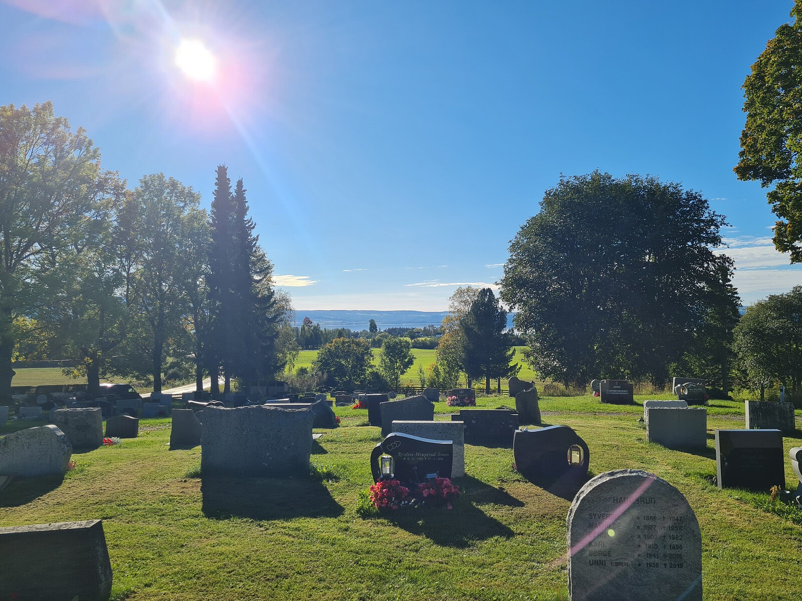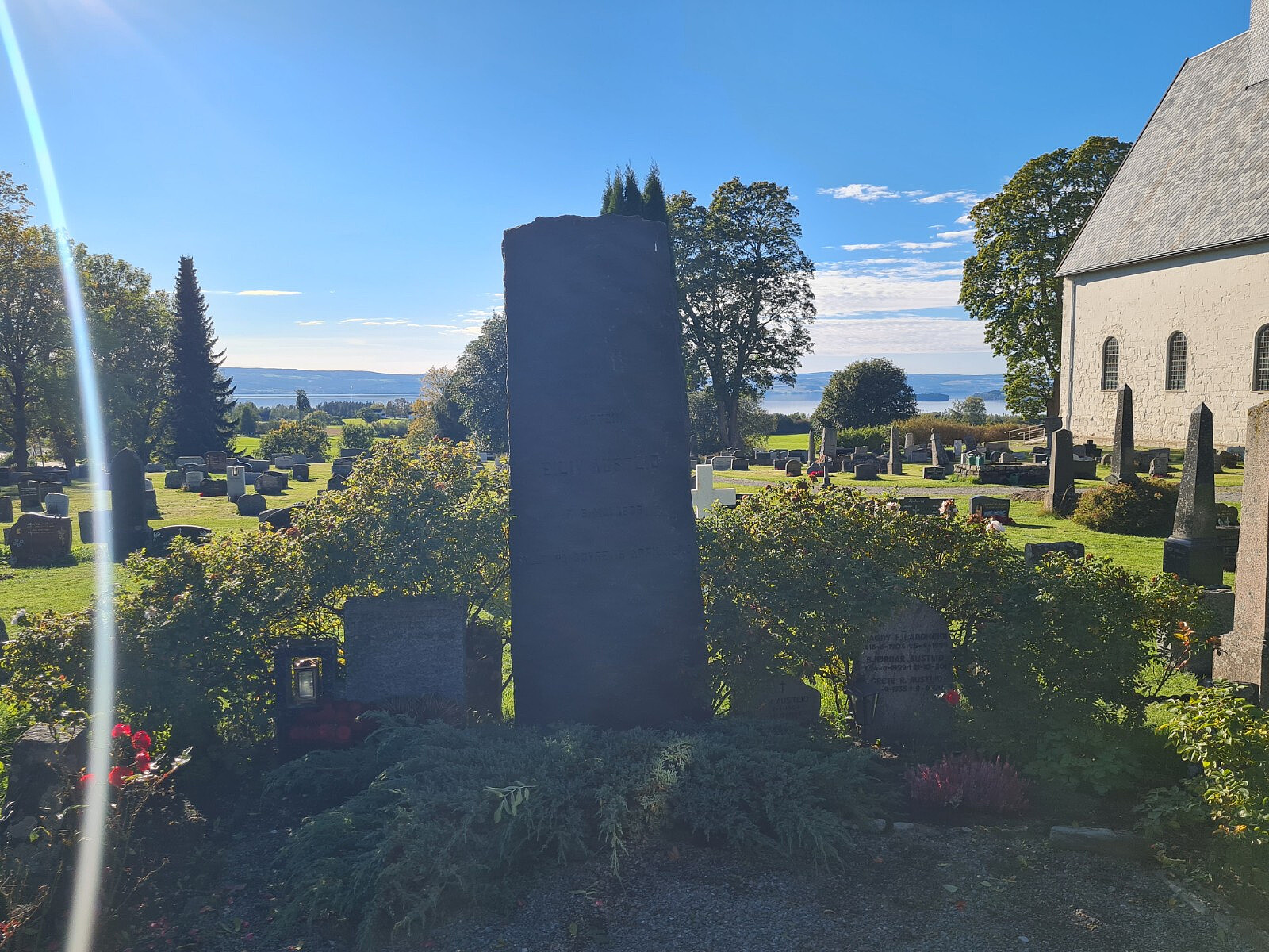 Etter besøk hos Evelyn og Dag i Fokholsgutua, stoppet Sigrid og jeg ved Stange kirke. Flott kirke og kirkegård, med fin utsikt mot Mjøsa og Helgøya.