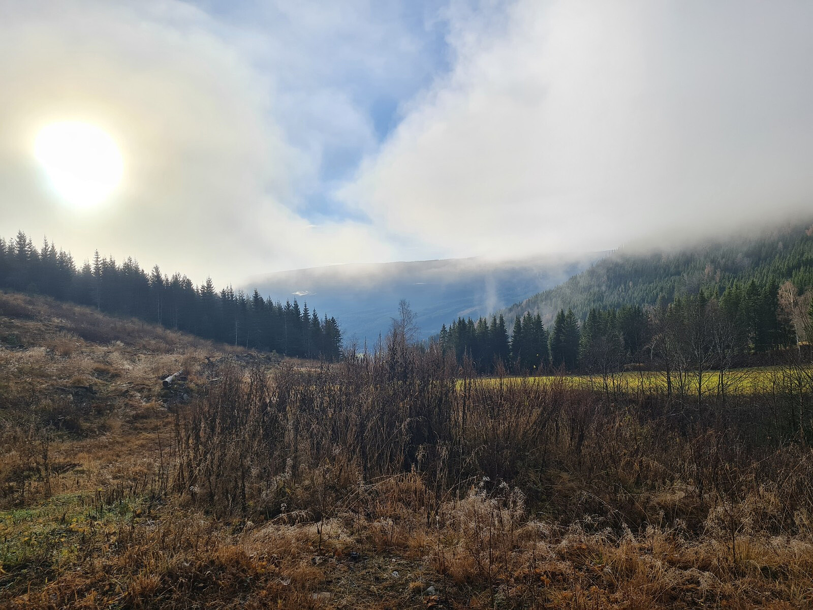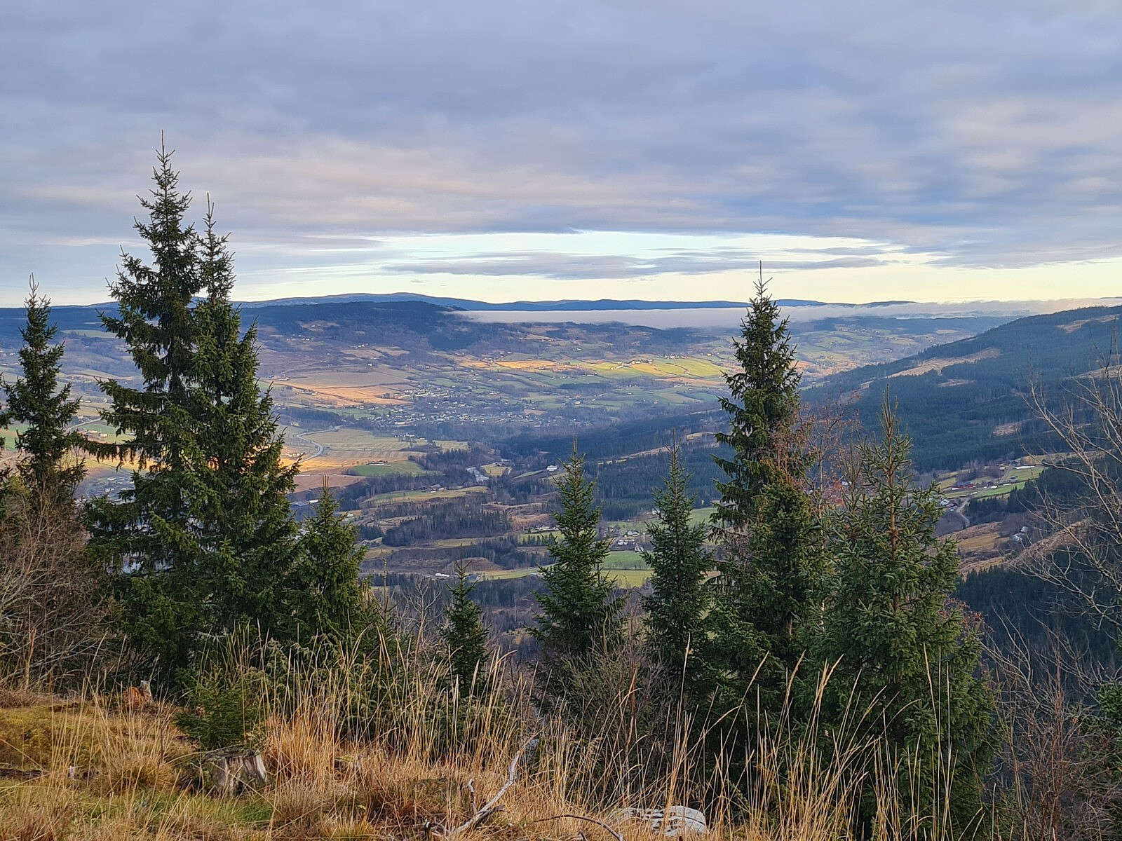 Etter å ha ventet på dyrlege på formiddagen, ble det tur etter at dyrlegen heldigvis ikke kom for sent. Kjørte og parkerte i Evenvoldvegen, og gikk en runde om Vardkampen og. Flatsteinhytta i finværet. Var litt tåke da jeg startet å gå, men den forsvant fort. Flott novembervær, 3-4 grader og vindstille.