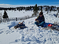 Sigrid og Marit skulle til Skei, og jeg traff dem på Seg.bru. Sigrid ville gå fra den øvre parkeringsplassen, men slapp av Marit og meg der jeg bruker å parkere i fjellandsbyen. Gikk sammen med Marit til Austli, men felleskiene hennes var håpløse i de steinharde skiløypene, så hun ville gå korteste veg til PeerGyntvegen. Jeg fortsatte til Bjørga, den siste kilometeren til fots da vegen var helt snøbar. Etter Bjørga fortsatte jeg over Kyrakampen, i dag med en lett avstikker til topps. Møtte etter hvert Marit igjen, og gikk sammen med henne til utgangspunktet i fjellandsbyen, hvor Sigrid kom og plukket oss opp. Veldig slitasje på klisteret, la pånytt klister to ganger, og da jeg tilslutt kom inn på nykjørt løype fungerte universalklisteret fint. Fin dag, litt vind på toppunktene.