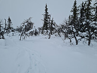 Sen start, finværet var over, ogdet ble snøvær og sterk vind. På vei ned Forsetseterlia etter skituren, satt det 3 orrhaner i ei bjørk ved veien. Men de fløy før jeg rakk å ta fram mobilen.