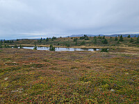 Sigrid skulle gå på Vågskardskampen, og jeg ble med for å gå en tur i området. Sigrid kjørte meg opp til Druktjønnhaugen, hvor hun snudde på parkeringslomma nedunder setra. Gikk først opp på Druktjønnhaugen. Nede igjen på setra traff jeg Kristin B. som skulle ut på sauleiting. Herfra over Kaldvassbekken, og om Kaldvassbekkhaugen til Østre Mjødokkberga. Derfra over på Mjødokkberga, og om Tortjønnlihøgda til Søre Suluhø. Videre til Nordre Suluhø, dagens høyeste topp. Herfra over Sørtoppen på Nordre Suluhø, fortoppen og om Østre Liomseterhaugen til Liumseterhytta. På Liomseter var det vedlikeholdsarbeid, og nybygging. Tror kanskje det er låven nede på Thallauglykkja som blir flyttet opp til turisthytta. En fin tur i lettskya pent vær, men veldig bløtt i terrenget. >>>