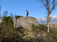 Vi parkerte på rasteplassen ved Refslandsveien. Vi gikk innover veien til vi var like nord for fjellet. Derfra gikk vi opp en gjengrodd sti eller tråkk i retning mot toppen. Stien var til dels nærmest usynlig, men vi kom ganske greit opp til toppen. Trig-punktet på toppen var helt gjemt under en einer. Lite utsikt fra toppen, men fin utsikt nord og sør på toppryggen.
