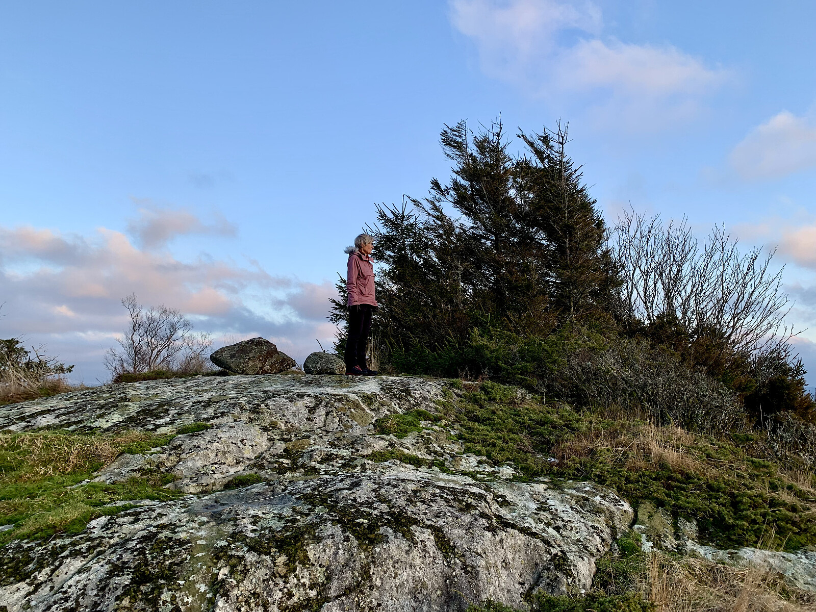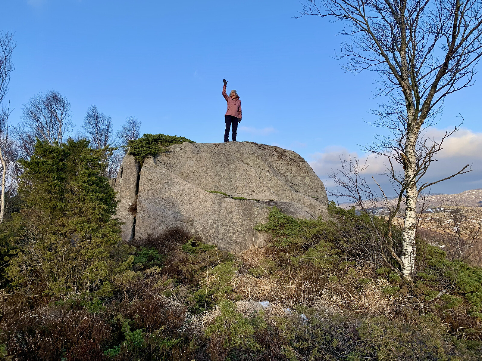 Vi parkerte ved innkjørselen til Selvik fra Lauvvikveien. Vi gikk på veien til Selvikvåg. Derfra gikk vi på stien langs sjøen mot Jektaberget. Så svingte vi opp mot Åsen og gikk dels på sti til toppen. Flott utsikt mot Høgsfjorden på toppen. Vi fulgte fjellryggen og gårdsvei nordøstover mot Lauvvikveien.