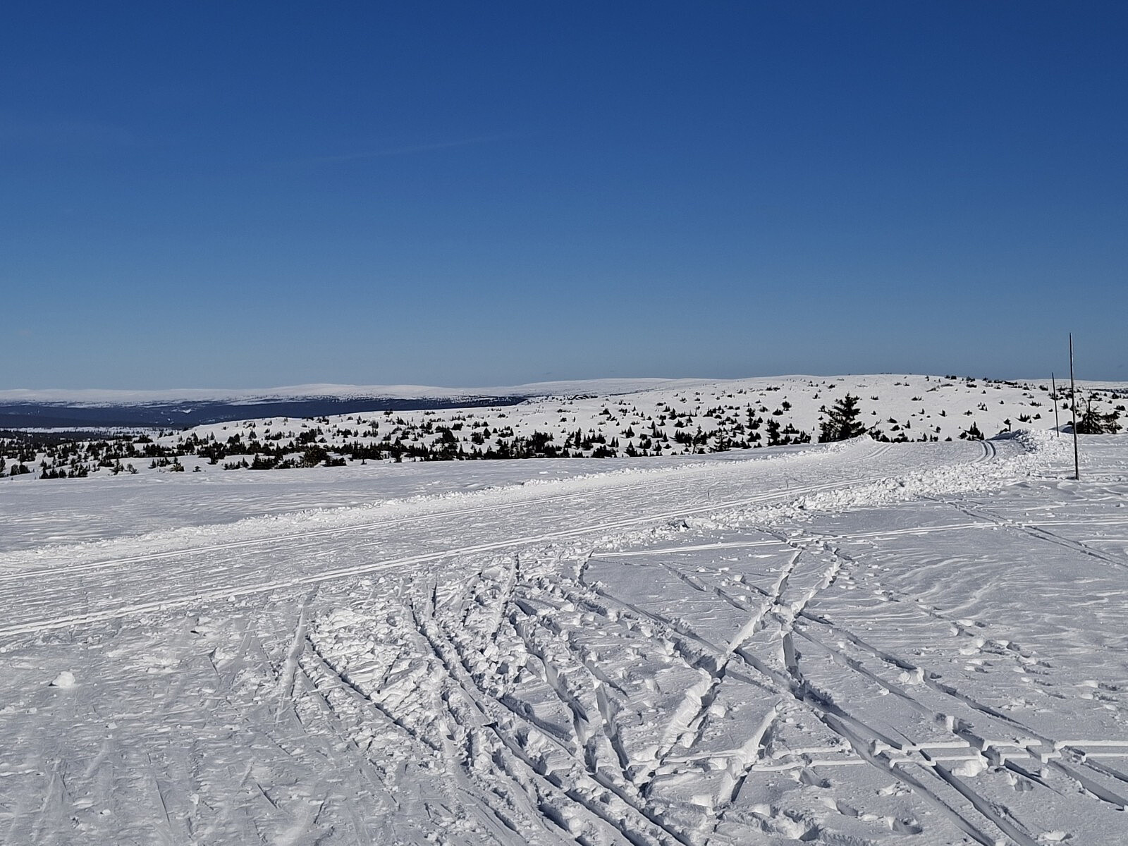 Hentet Marit i Nerbuvegen og Per Ole på Segalstadbrua. Slapp dem av ved Fjellandsbyen og kjørte til parkeringsplassen ved bommen på Peer Gyntvegen. Var heldig da løypemaskina kjørte innover da jeg begynte å gå. Sol fra skyfri himmel, motvind innover, medvind tilbake. Snudde der løypa til Slagsfjellet tar av. Videre på Peer Gyntvegen var det steinhardt. Det ble en flott tur.