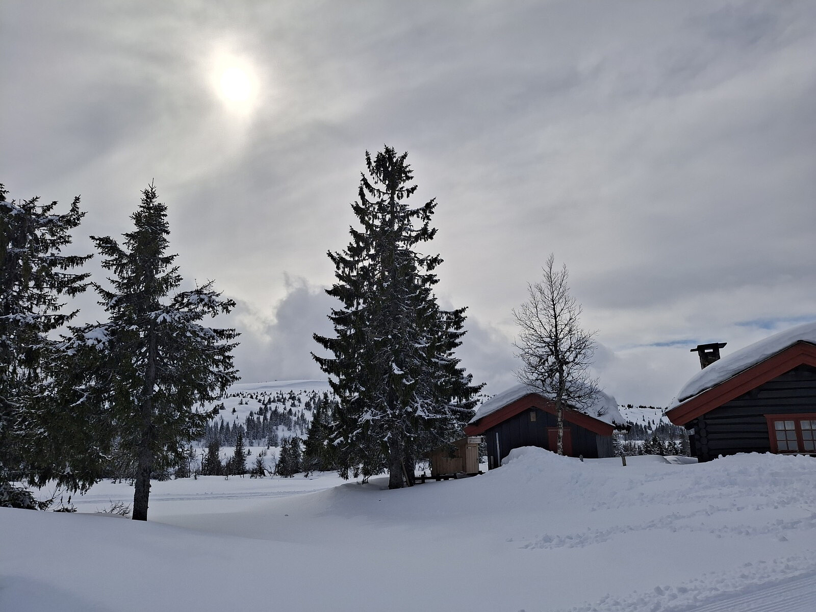 Grått og litt snøvær på morgenen. Skiftende skydekke mens jeg var på tur.