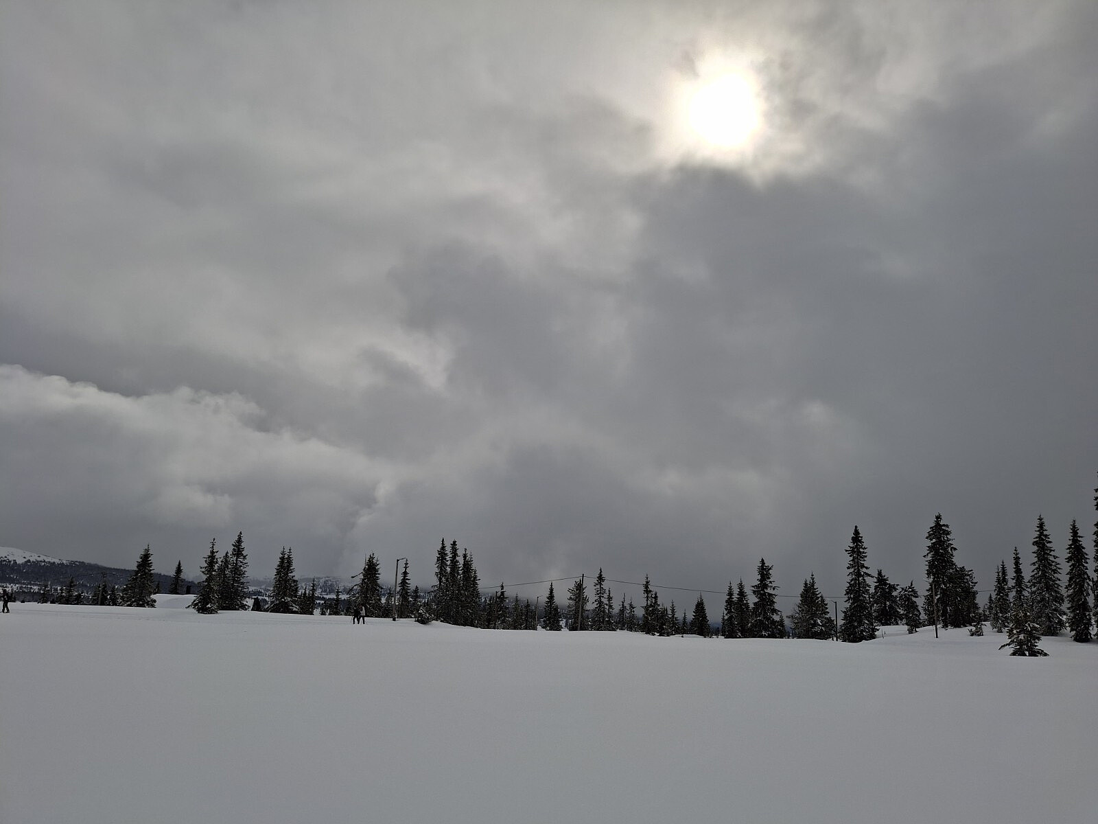 Grått og litt snøvær på morgenen. Skiftende skydekke mens jeg var på tur.