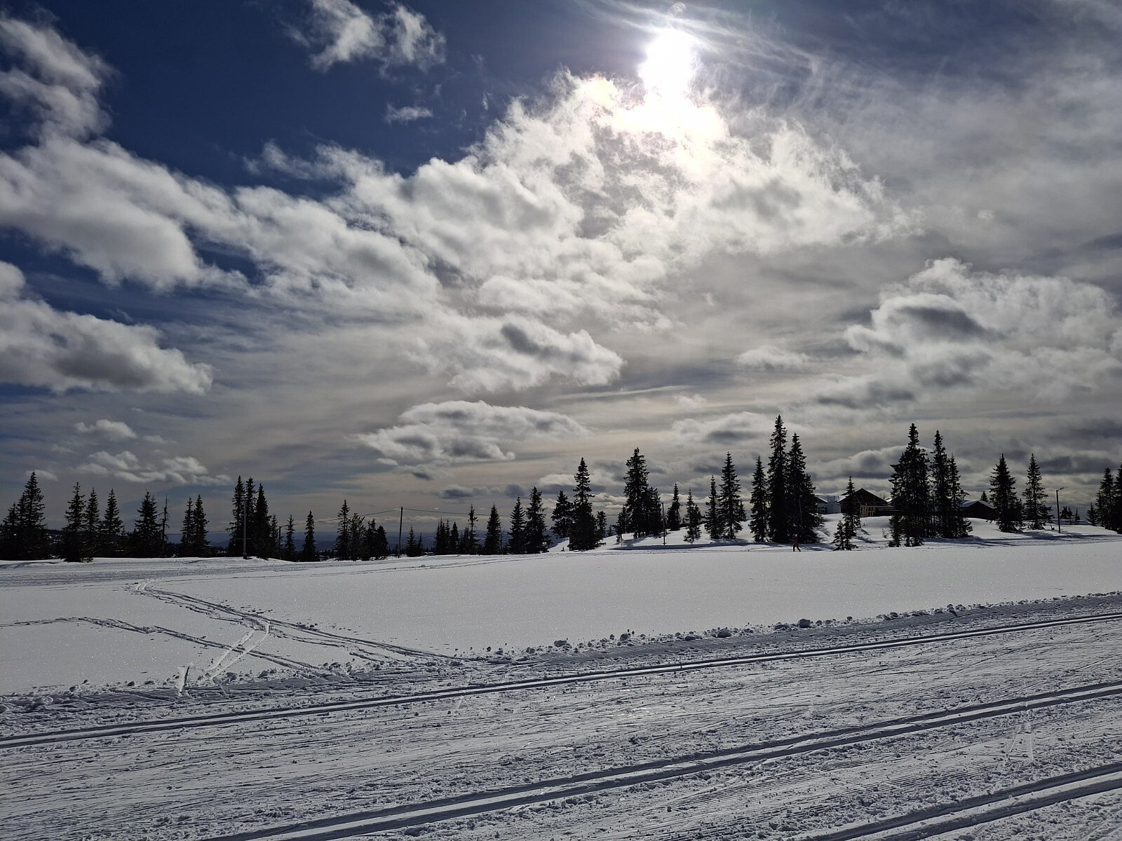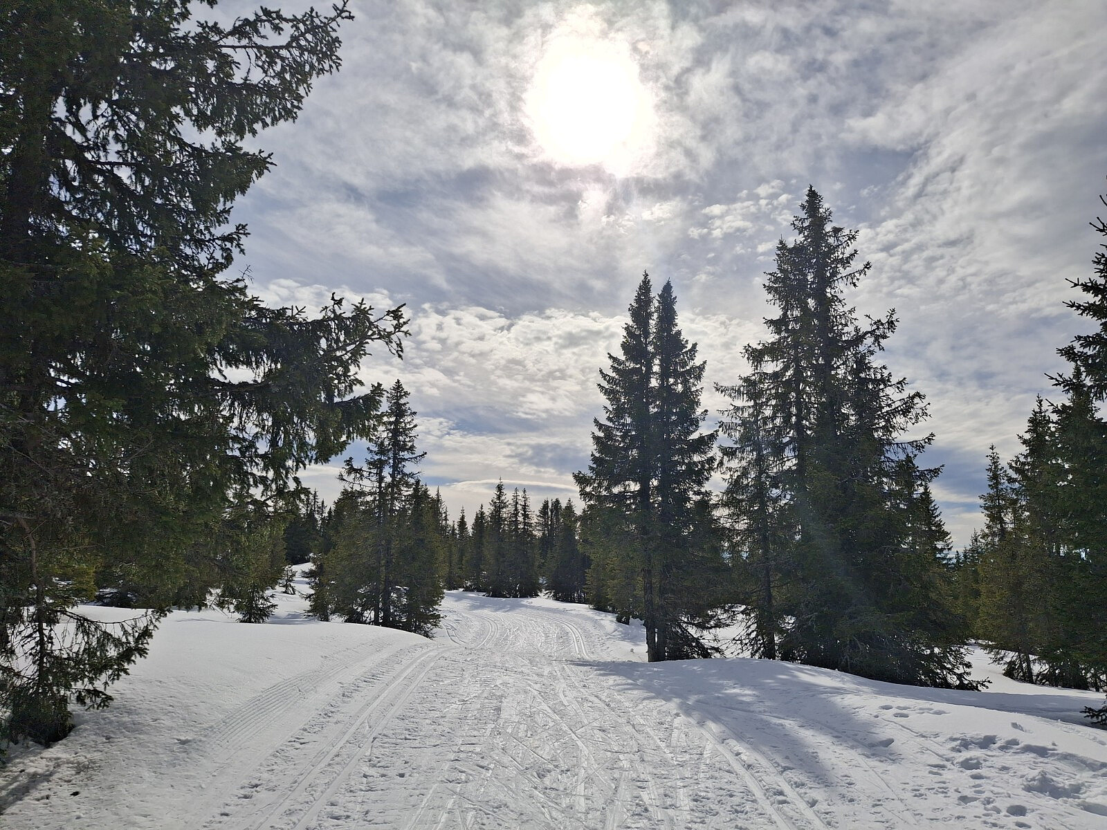 Skitur i nykjørte løyper, skiftende skydekke, mye sol, litt vind.