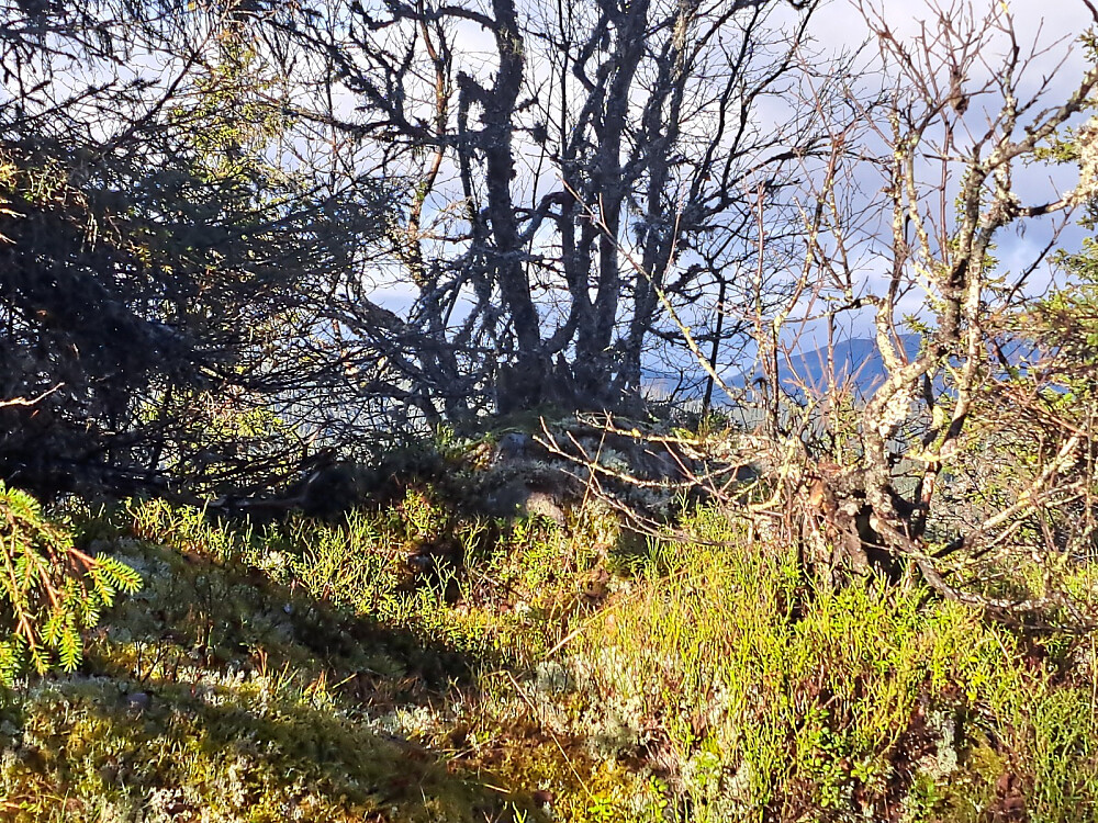 Vi gikk bare på retningen oppover, litt vått, litt kratt, litt myr og etterhvert litt bratt, men helt framkommelig. Vi kom oss opp på toppen, helt anonym. Litt utsikt på sidene, men ikke den store opplevelsen.