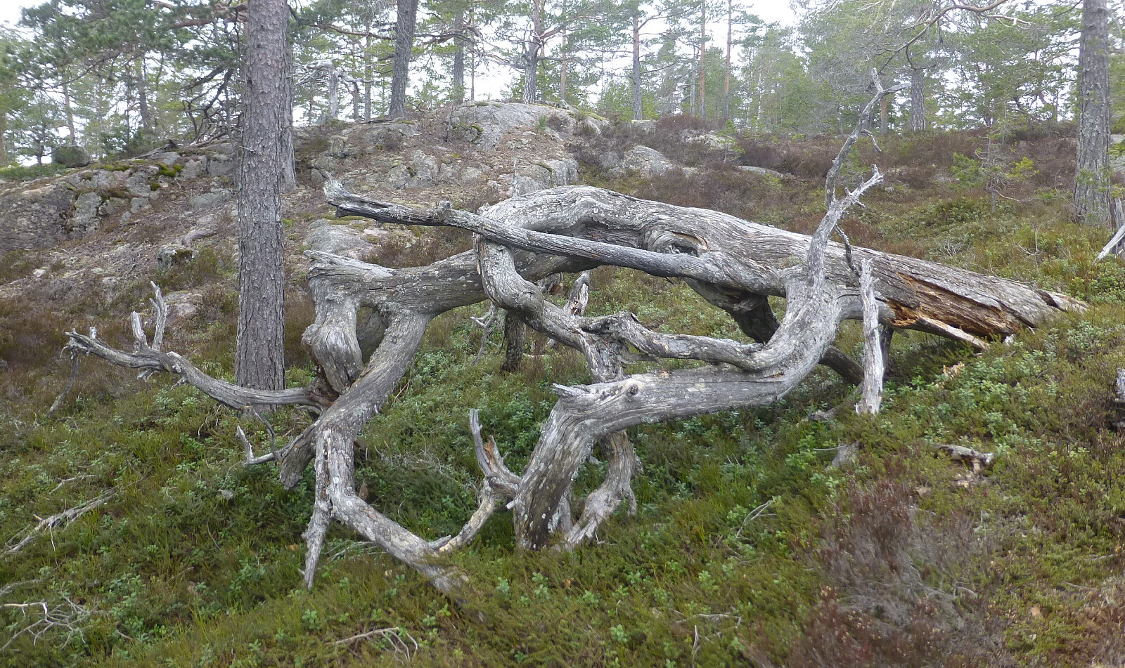 Det startet veldig lett og bra med ryddet traktorveg. Lettgått helt opp i Almedalen. Jeg hadde satt meg ut ei skor jeg skulle gå opp mellom alle skrentene. Det var ikke så lett å finne den for litt tett skog, men da jeg kom fram, så så det ut som en litt gjengrodd traktorveg. Det ble etterhvert brattere og siste kneika var det dyretråkk. Så var det bare å tusle i fin skog, prøve å unngå en dal som kom inn fra venstre, og gå til toppen. Ingen utsikt, men flott skogsterreng. Da jeg nesten var oppe tok jeg meg en liten pause som jeg pleier. Her sang toppmeisen og i det jeg tok av meg sekken skimtet jeg en elg i retning toppen. Det så ut som en fjoring, en som har blitt kastet ut hjemmefra i disse tider.