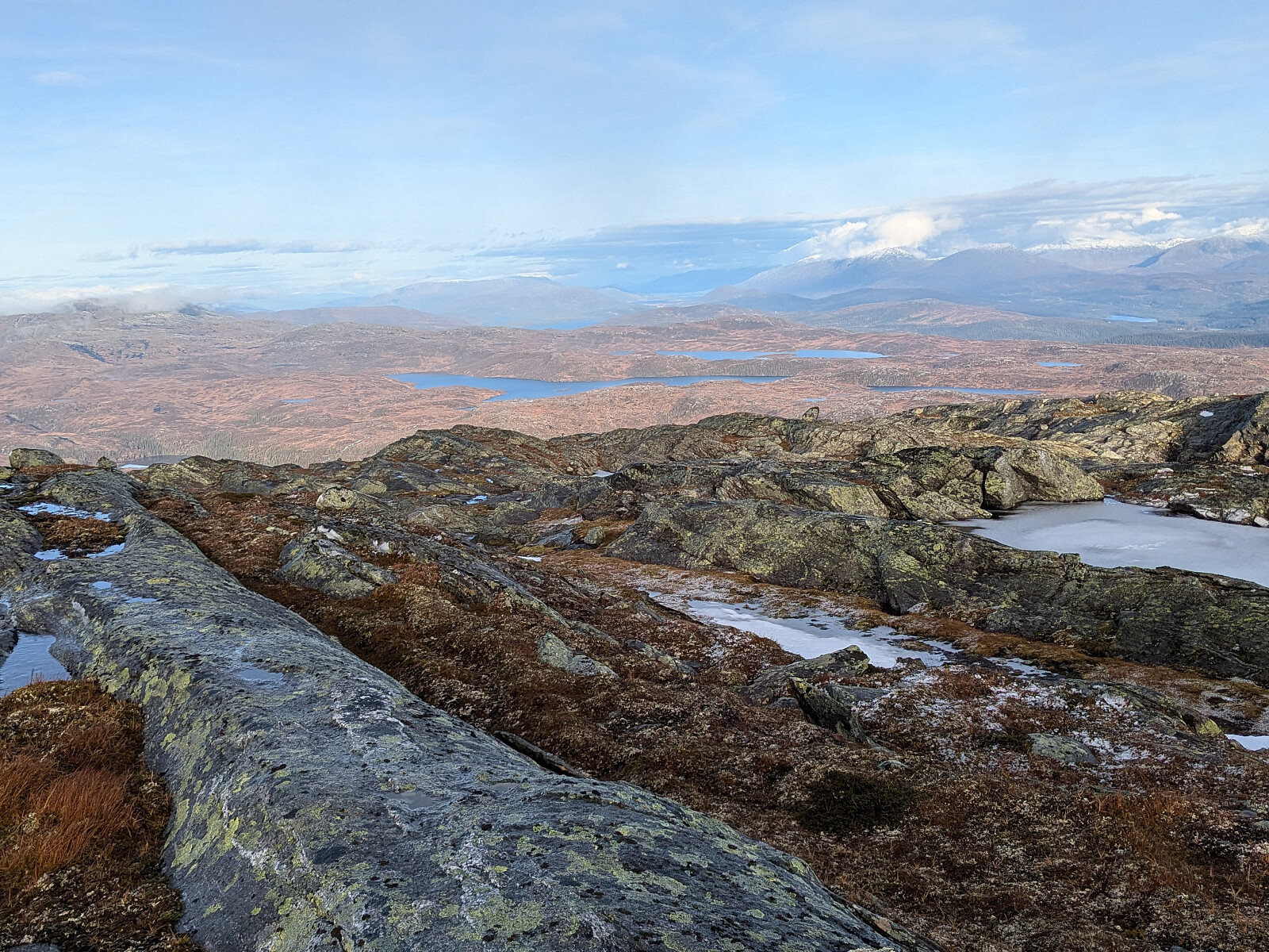26 Oktober 2024. Siste sjanse for en flott høsttur uten snø. I dag var det sol, vindstille og plussgrader. Neste uke er det gult farevarsel for mye snø. Like etter Namsskogan Sentrum kjørte jeg til venstre etter Frøyningsdalsveien. Et stykke innover er det bomvei, så jeg betalte 70 kroner med vipps til Namdal Bruk. Jeg kjørte over brua over Frøyningselva og tok til høyre ved skilt Elgåsen. Her er det en stor parkeringsplass. Det var ingen elgjegere å se i området. Første del av turen gikk over store myrområder, og videre gikk jeg opp Skarvdalen opp mot Seterfjellet. Turen videre gikk langs flere flotte tjønner. Første mål var Holofjellet 893 moh. Topp nummer 31 i Namsskogan. Her var det flott utsikt mot det spektakulære Båtfjellet og mot Frøyningsfjellet, som var mitt neste >>>