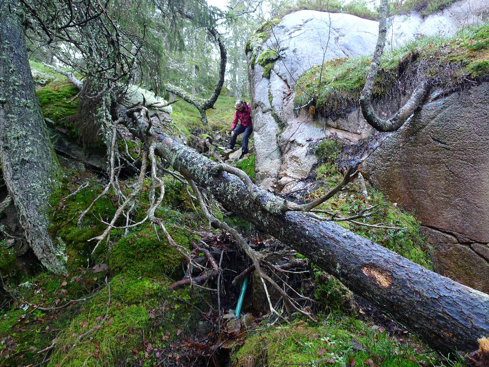Fra toppen gikk vi sørover til hytten og telemasten. Herfra fulgte vi kabeltraséen nedover bratten uten problemer. Tilbake ved bilen etter knappe 2 timer. Fin skogstur med litt trim både for Ayla og oss i flott høstvær!