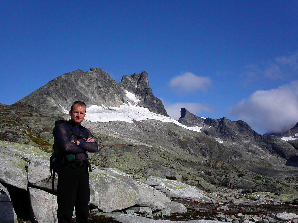 31.08.2003 - Per Rune ved Gravdalsbandet, med imponerende og mektige Austanbotntindane (2204) bak, midt i bildet og litt til venstre. Lengre bak og litt til høyre for midten er Store Ringstinden (2124).