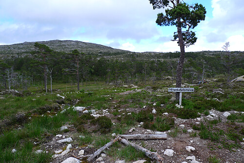 Der traktorveien svinger østover og en skal ut i terrenget, er det satt opp skilt som peker mot toppen. GPS her 32V 476678 7039545.