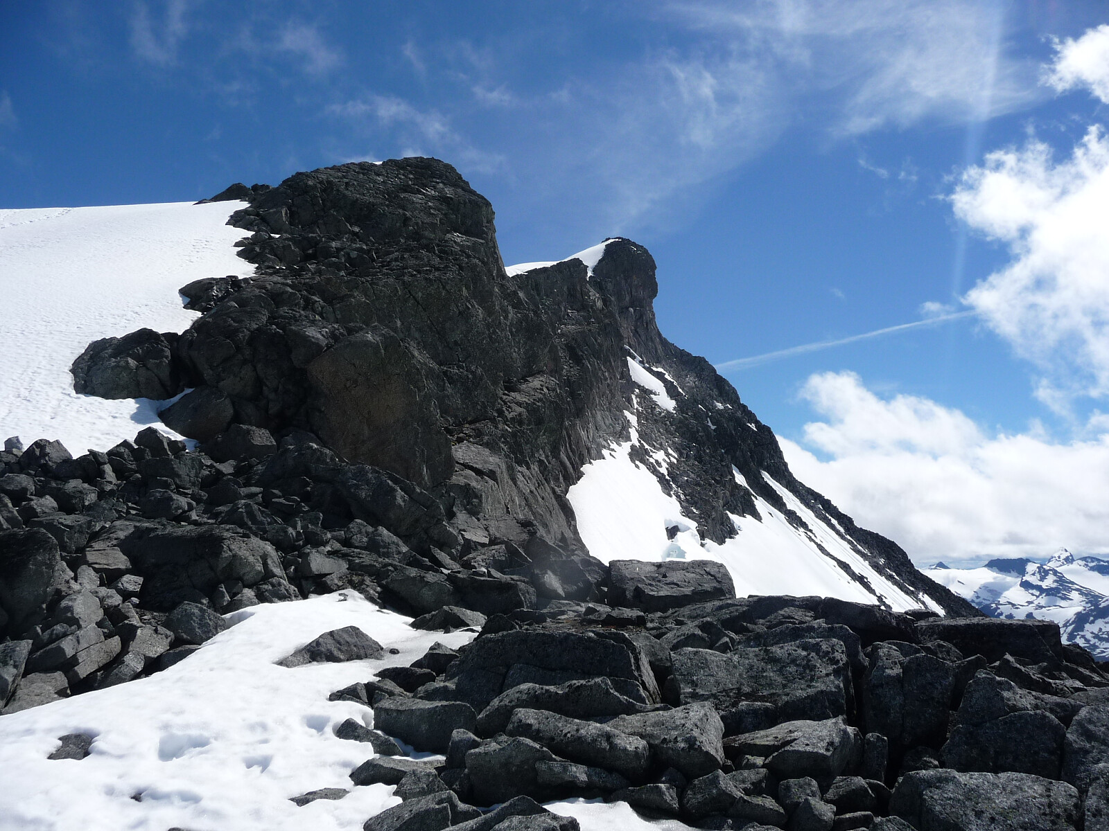Så var vi i Jotunheimen med mine vanlige turkammerater. De ønsket å besøke Storebjørn igjen da de for to år siden var der å feiret 50 årsdag, men ikke hadde utsikt i det hele tatt. Værprognosene var bra så vi la ivei. Vi stilte med eget tau, stegjern og isøkser. Nødvendig utstyr for å bestige Storebjørn. Vi fulgte vanlig rute og fulgte ett ganske ferskt spor opp breen til toppen. Ett vanskelig punkt ved Bjønnlabben, der er det store sprekker i isen og snøen begynte å være svak. Alternativer var over Bjønnlabben eller langt ute til venstre. Vi likte ingen av de alternativene så vi satse over snøbrua. Det gikk bra tross at det så usikkert ut. Resten av turen var bare strålende, skyene letta så utsikten ble fantastisk. Gikk et snø og steinras fra Veslebjørn på vei ned, heldivigs langt unna oss, men skvatt av bulderet.