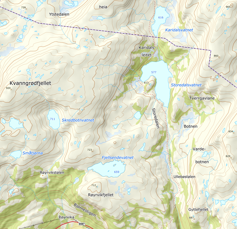 Endelig meldt finevær, og etter grytidlig start på jobbdagen klarte jeg å rydde såpass plass at det lot seg gjøre å komme tidlig av gårde på E39, hadde planer om et par topper i sydlige del av nordfylket i dag; av forskjellige mystiske grunner ble ikke planene gjennom ført helt som tiltenkt..Primær(faktoriell)e mål var Kvanngrødfjellet med pen pf. En liten kilometer før Vadheim sentrum svingte jeg av tvert mot vest mrk Guddal, på smal men god vei som først førte via hårnållssvinger oppover, siden flatere til jeg ankom Røyrvikvatnet. Parkerte utenfor et skur på nordsiden av dette i Røyrvika. Jeg så etter sti men kunne ikke finne tegn til noen og la i vei oppover terrenget, som var myrete, vått og sugende. Et stykke oppe så jeg ferske tråkk hvor gress og mose var nedtrampet, regnet med at dette var spor etter hjortejegere; mente jeg hadde truffet et par av dem på vei opp hårnålssvingene. Terrenget var stedvis noe bratt, og "terrassert", og etter litt var jeg oppe på snaufjellet. Været var solrikt og mildt med en svalende bris fra sydlig retning.